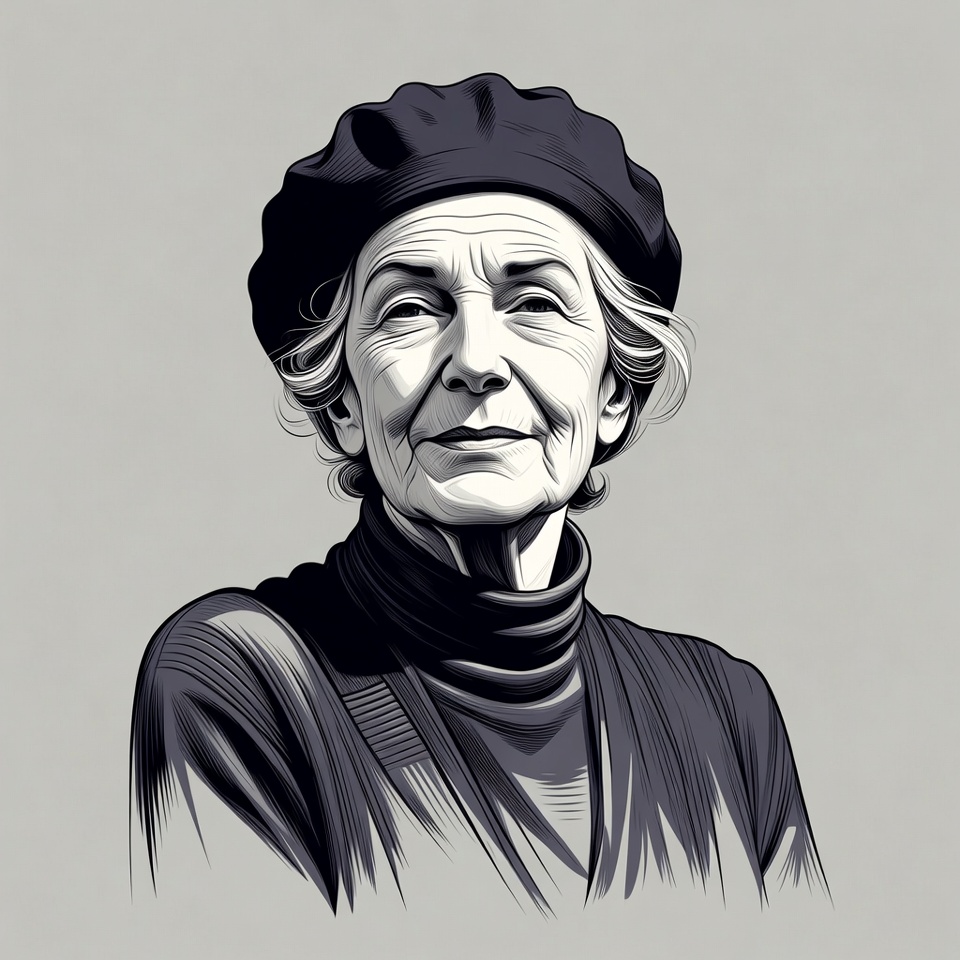 A digital illustration of an elderly White woman with short wavy hair gazes forward. She wears a black beret tilted on her head and a black turtleneck sweater. The portrait is rendered in grayscale tones against a plain gray background.