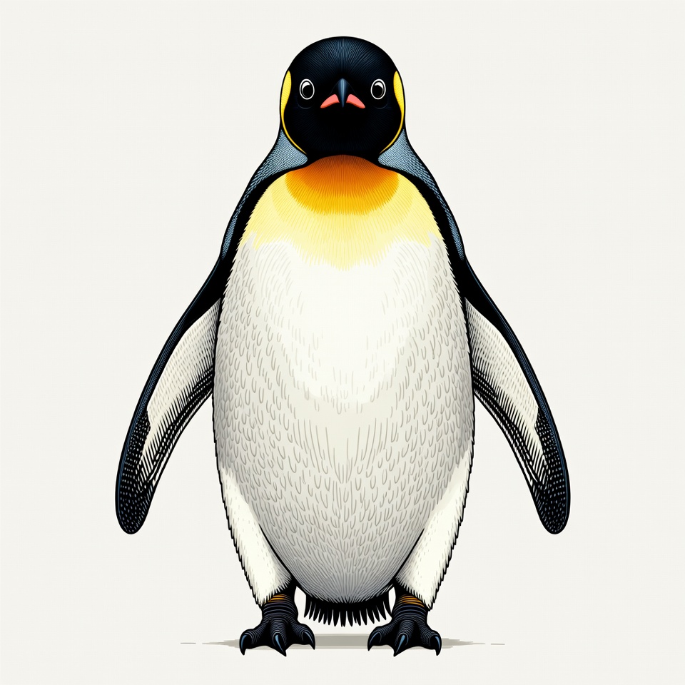 animal, bird, black white, clipart, feathers, feet, illustration, isolated background, orange neck, penguin, plump bird, red eyes, vector art, wildlife, wings, yellow head, emperor penguin