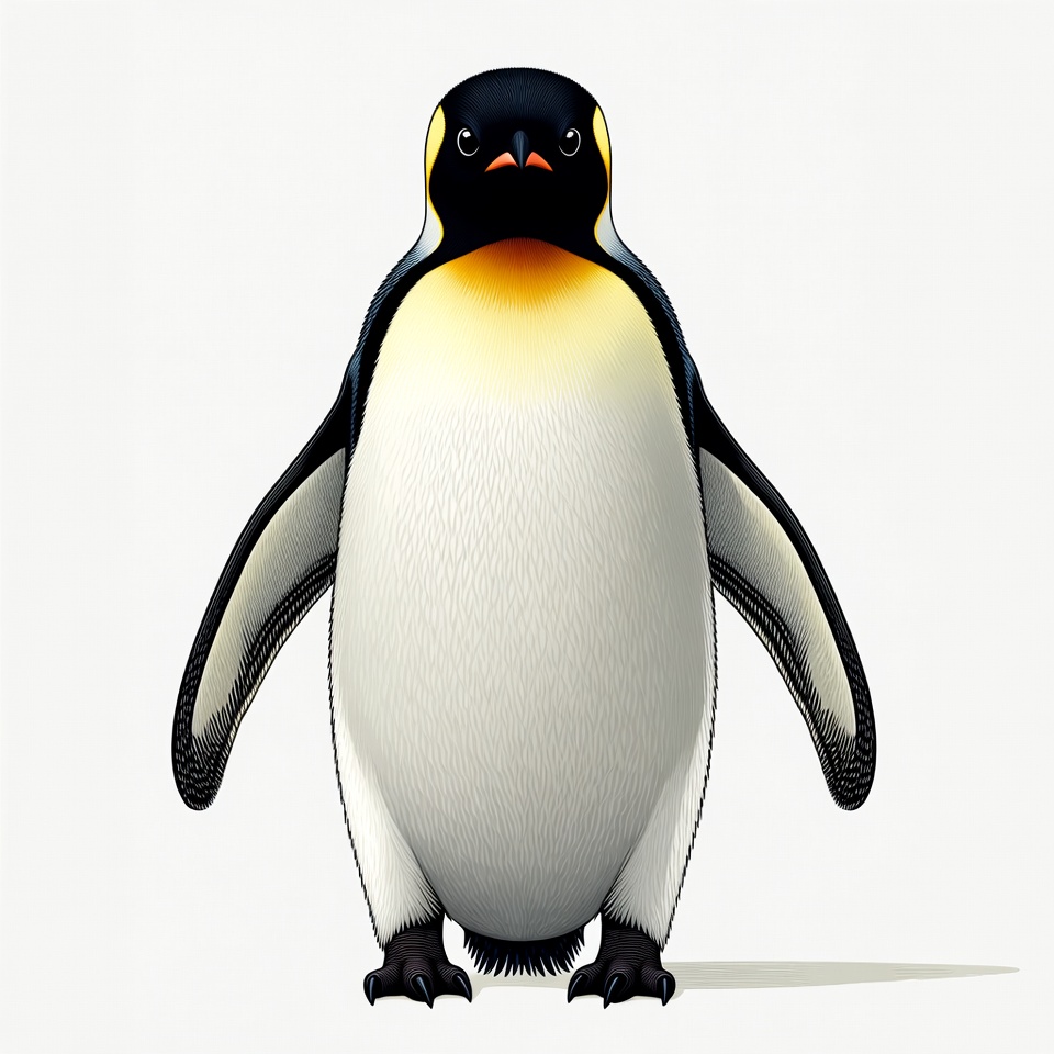 A detailed cartoon illustration of an emperor penguin stands on a white isolated background. The penguin features black wings and head, yellow ear patches, orange beak, and fluffy white belly. It faces forward with wings slightly spread and a subtle shadow beneath its feet.