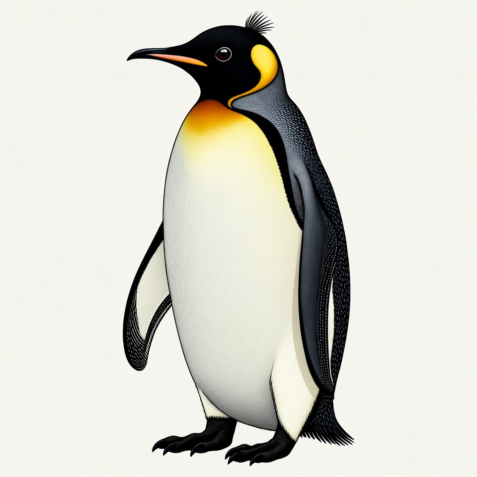 A detailed illustration of a king penguin stands on a white isolated background. The penguin features black feathers, a white belly, yellow and orange patches on its head and neck, and a sharp orange beak. Its flippers are slightly outstretched, showcasing its distinctive crested appearance.