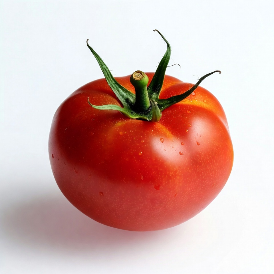 food, fresh tomato, glossy tomato, green stem, isolated background, organic tomato, produce, raw tomato, red tomato, ripe tomato, single tomato, tomato leaves, vegetable, water droplets, tomato