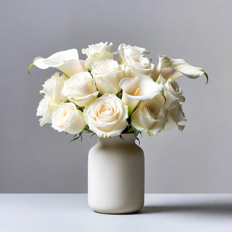 A bouquet of white roses and calla lilies is arranged in a white vase. The flowers feature lush petals and elegant stems against a plain gray background. The composition is centered on a simple surface.