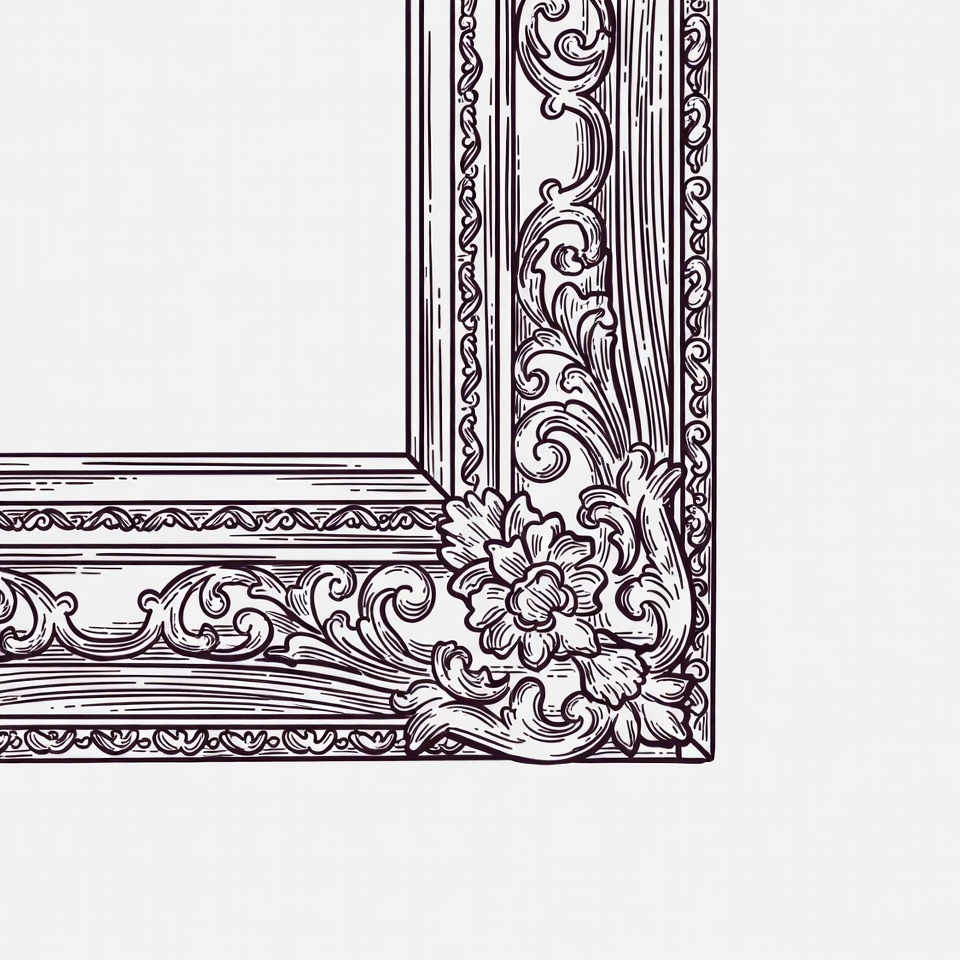 A detailed line art illustration of an ornate empty picture frame with intricate floral and scroll designs. The frame features elaborate carvings including a central flower motif and curving vines. It stands isolated against a white background.