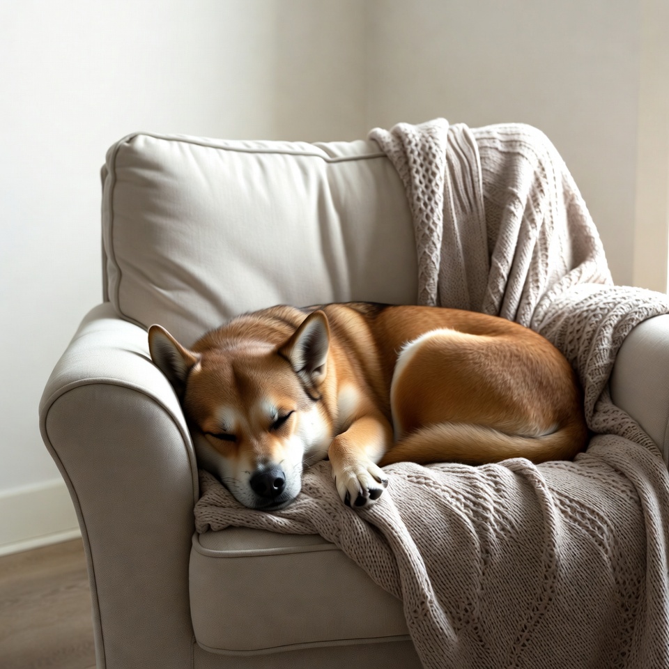 armchair, asleep, blanket, canine, chair, cozy, curled up, dog, furniture, gray blanket, indoor, isolated background, nap, pet, relaxed, room, sleeping, tan fur, white fur, white wall, wooden floor, Shiba Inu