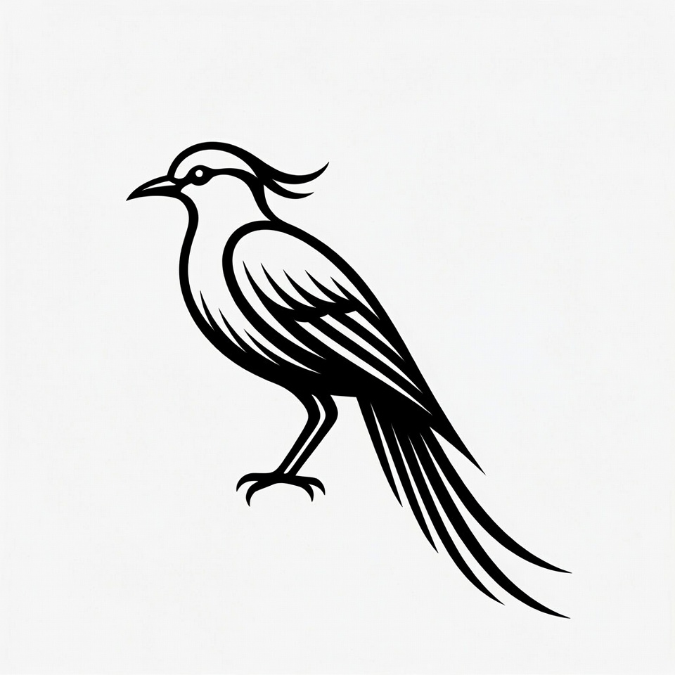 avian, bird, black and white, clipart, crest, detailed outline, elegant, feathers, illustration, isolated background, line art, mythical bird, side view, silhouette style, standing, tail, vector, wings, phoenix