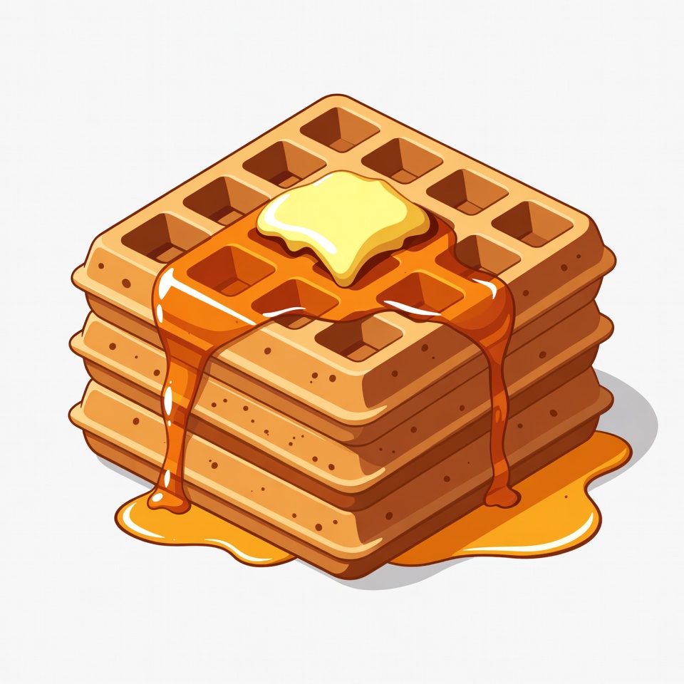A stack of four golden waffles drips with amber syrup and topped with melting butter pats. The illustration features a textured waffle surface and syrup pooling at the base. It is rendered in a vibrant cartoon style on a white isolated background.