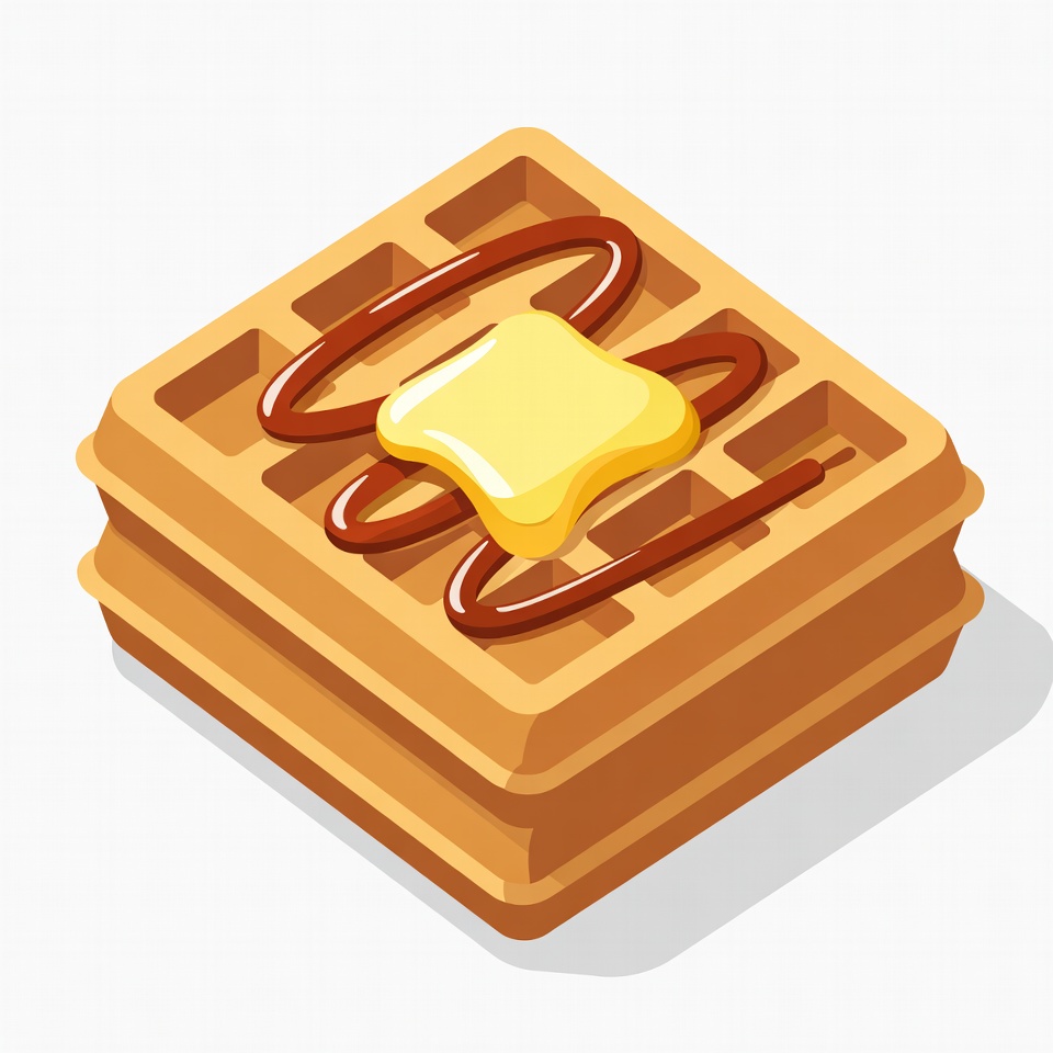 breakfast, breakfast food, butter, chocolate syrup, clipart, delicious, dessert, food, fresh, golden, gourmet, illustration, isolated background, melting butter, pastry, stack, stacked waffles, sweet, syrup swirl, topping, vector, waffles, waffle