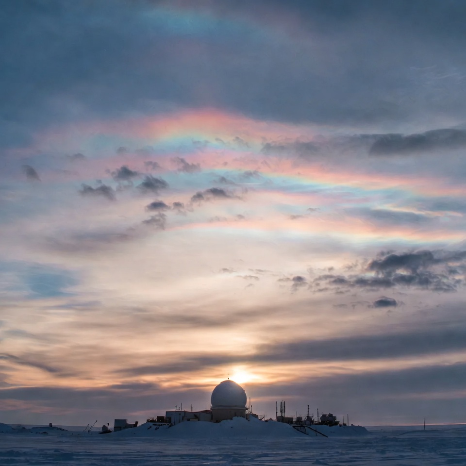 antarctica, antennas, arctic, atmospheric phenomenon, buildings, clouds, cold, halo, ice, isolated, optical phenomenon, parhelia, polar, radar station, radome, research station, science base, sky, snow, snowy landscape, sundog, sunset, twilight, white dome, winter, sun dogs
