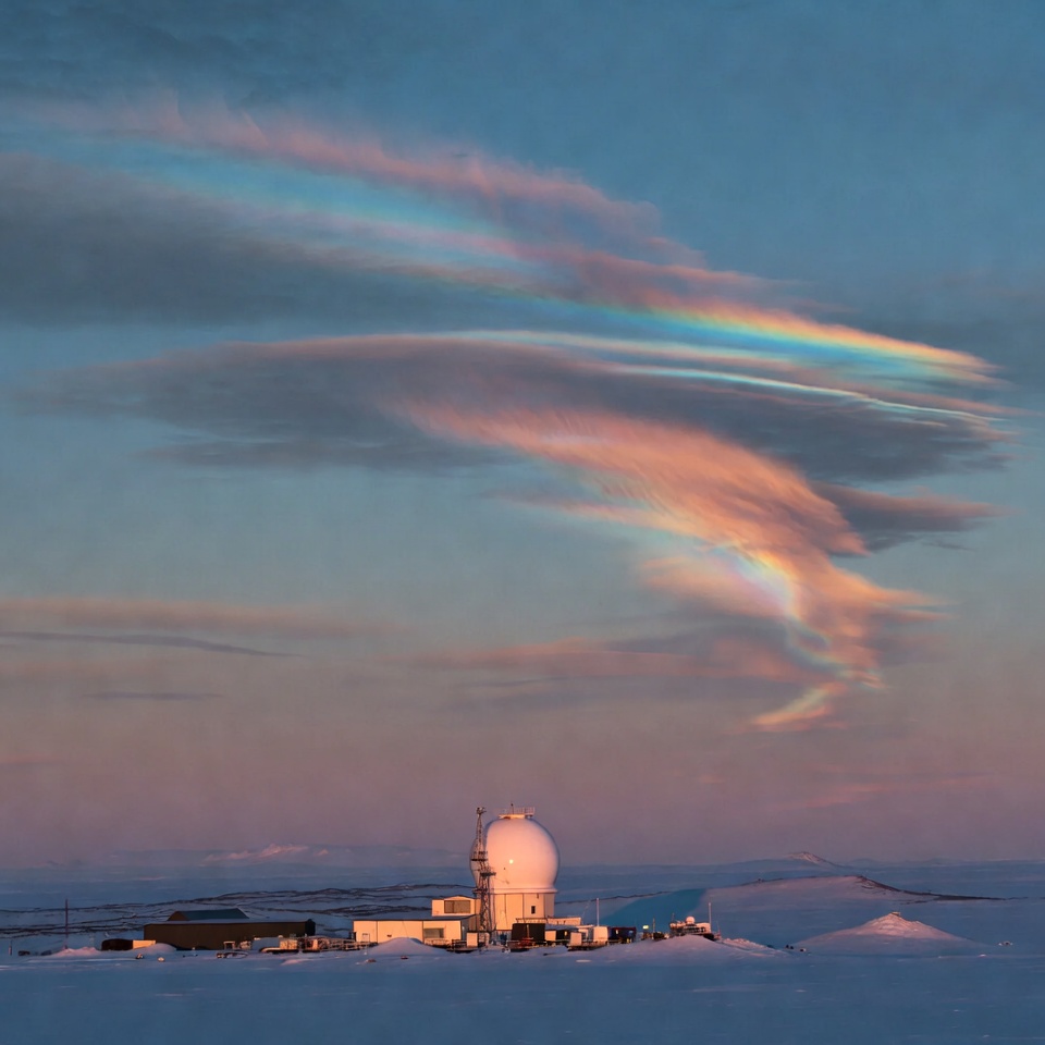 A white radar station with a large dome sits on a snowy landscape surrounded by icy hills. Above it, colorful iridescent clouds display rainbow hues against a twilight sky with pink and blue tones. The scene captures the station illuminated amid the vast frozen expanse.