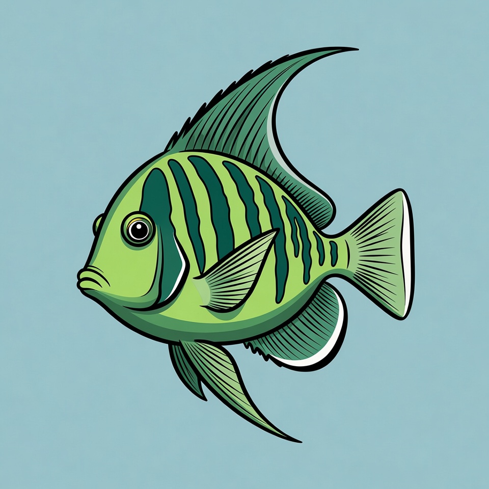A vibrant green angelfish with bold black stripes swims against a light blue background. The illustration features detailed fins and expressive eyes. It is depicted in a cartoon style with clean outlines.