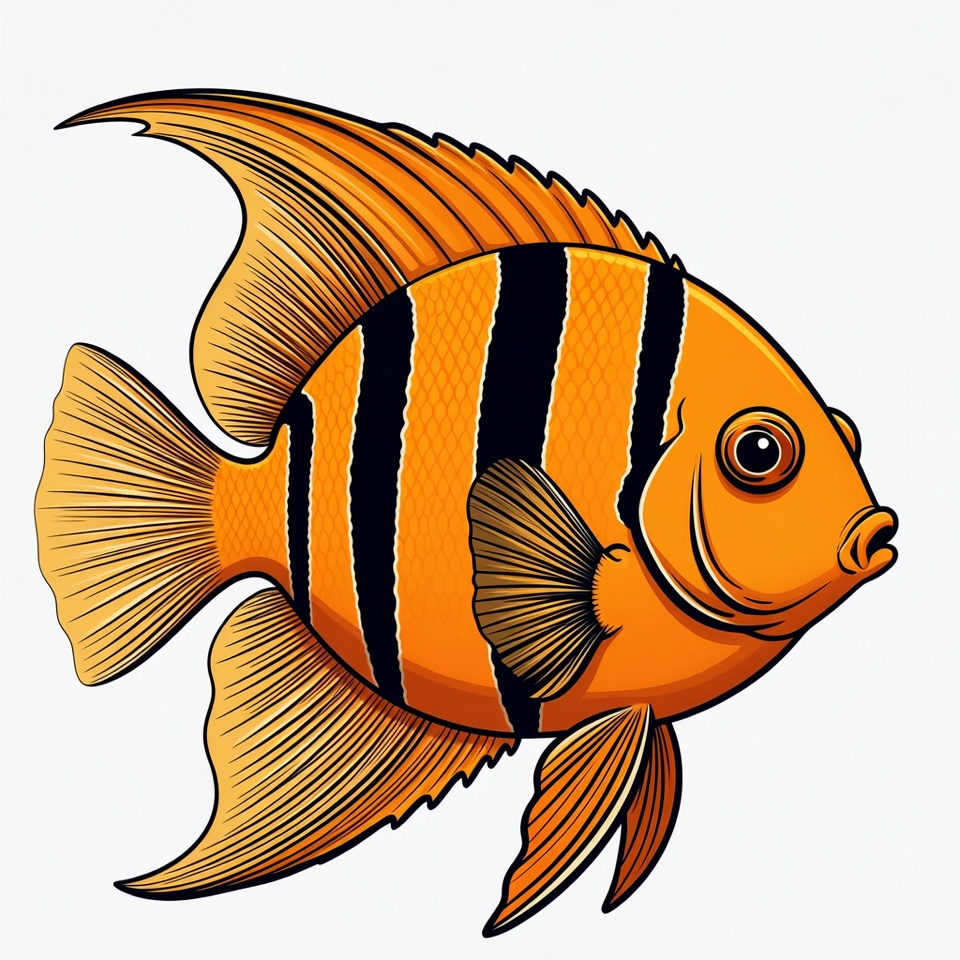 angelfish, aquarium fish, big eyes, black stripes, cartoon fish, digital drawing, fish illustration, flowing fins, graphic art, illustration, isolated background, marine animal, ocean life, orange fish, saltwater fish, sea creature, tropical fish, vector art, vibrant colors, clownfish