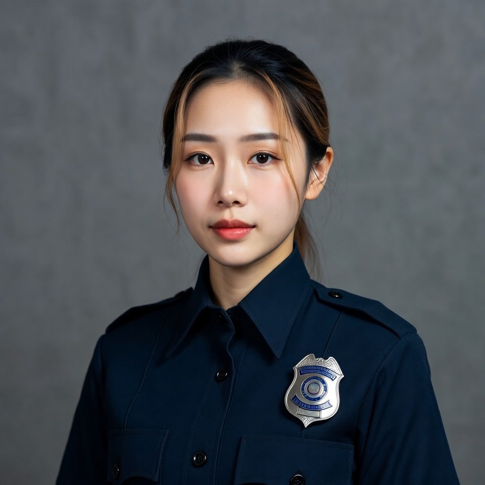 A young Asian woman with long dark hair tied in a ponytail stands against a gray background. She wears a navy blue police uniform shirt with a shiny badge on the chest and has a serious expression. Her face features prominent eyes and subtle makeup.