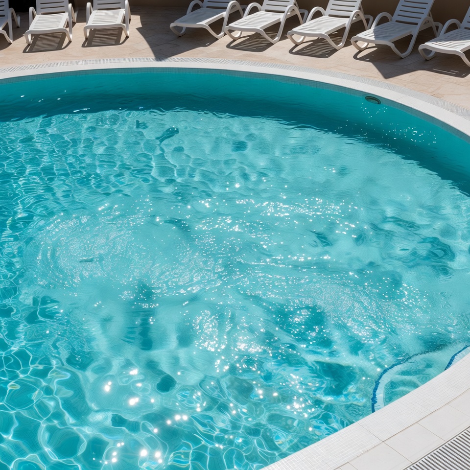 A round turquoise swimming pool features clear rippling water under sunlight. White lounge chairs are arranged in rows on the tiled pool deck surrounding it. The scene shows an empty outdoor pool area with no people.