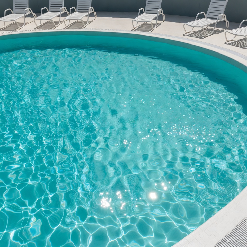 circular pool, clear water, concrete wall, deck, empty pool, lounge chairs, outdoor pool, pool, pool chairs, poolside, reflections, resin chairs, resort pool, round pool, sunny pool, tiled deck, turquoise water, vacation pool, water ripples, white chairs, swimming pool