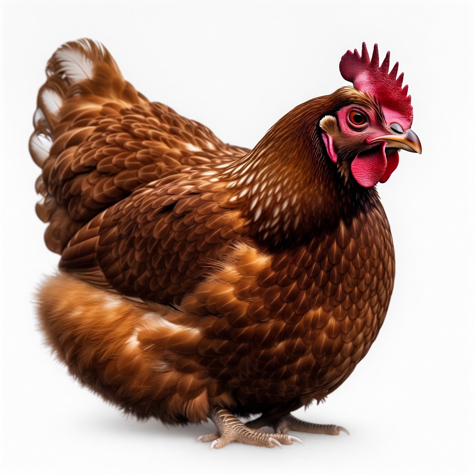 A detailed brown hen with reddish feathers stands on a white background. It features a bright red comb and wattle, along with white feather accents on its wings and tail. The chicken faces forward with a realistic, fluffy appearance.