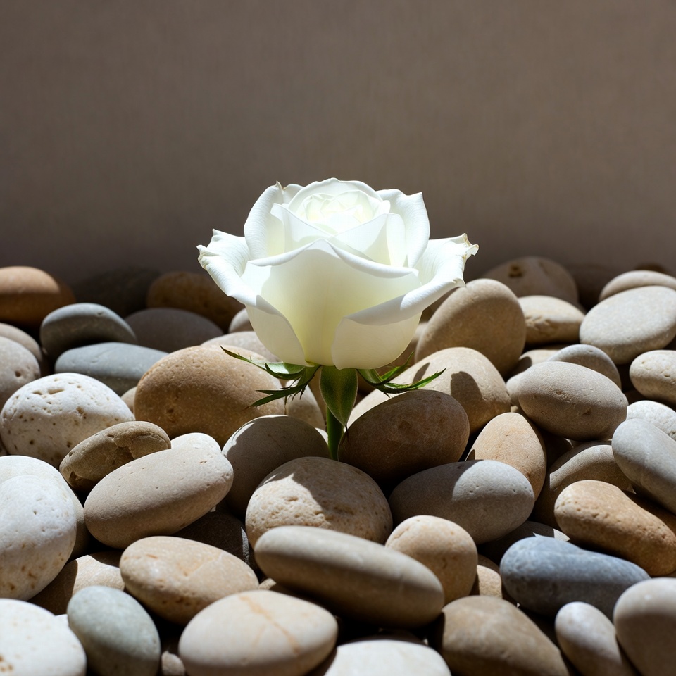 A single white rose with green stem stands prominently among smooth pebbles. The petals are fully bloomed and bright white against the gray and beige stones. Soft sunlight illuminates the scene from above.