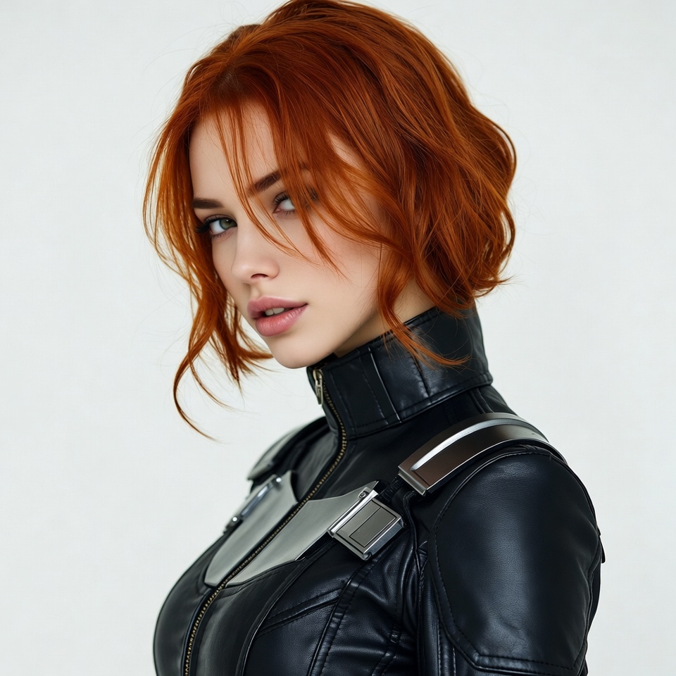 White, black suit, bob haircut, female, futuristic outfit, high collar, leather jumpsuit, metallic pads, portrait, red hair, redhead, side profile, white background, young woman, woman