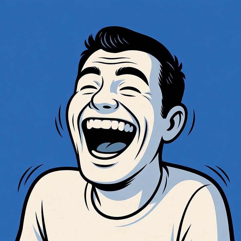 A cartoon illustration of a man with short black hair laughing with his mouth wide open and eyes squinted in joy. He wears a simple white t-shirt and is depicted against a solid blue background. Bold black outlines and motion lines emphasize his energetic laughter.