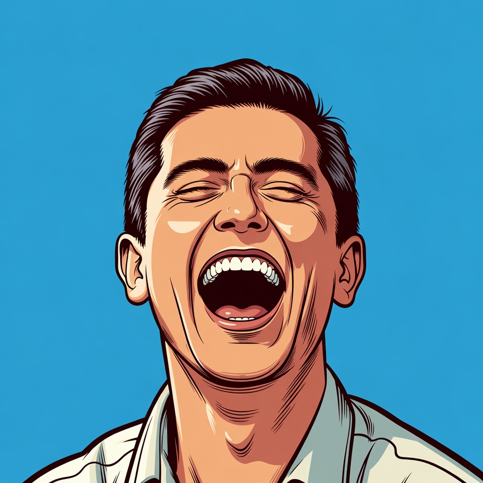 A cartoon illustration of a man with short dark hair laughing heartily on a solid blue background. He wears a light-colored collared shirt and has squinted eyes with a wide-open mouth showing teeth. The vibrant pop art style emphasizes his joyful facial expression.