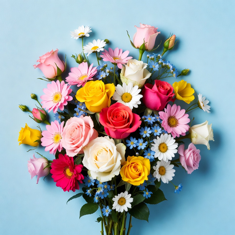 A vibrant bouquet of assorted roses in pink, red, yellow, white, and orange sits atop green stems against a solid blue background. Daisies, baby's breath, and blue flowers add variety to the floral arrangement. The flowers are tightly clustered and freshly bloomed.