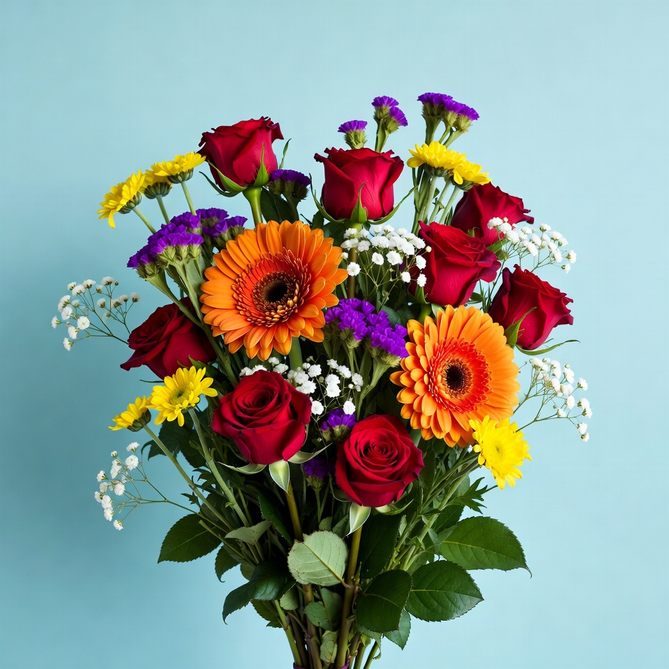 A vibrant bouquet of red roses, orange gerbera daisies, yellow daisies, purple statice, and white filler flowers is arranged with green stems. The flowers are tied together and displayed against a solid light blue background. The composition is centered and isolated for a clean presentation.