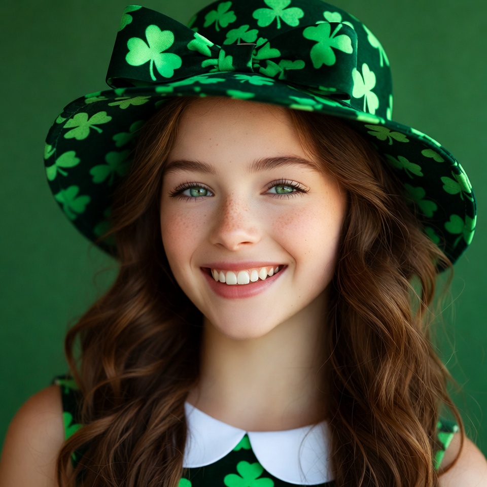 A young girl with long brown wavy hair smiles happily while wearing a large green shamrock-patterned hat with a big bow. She has green eyes, freckles, and is dressed in a green shamrock dress with a white collar. The image is set against a solid green background.