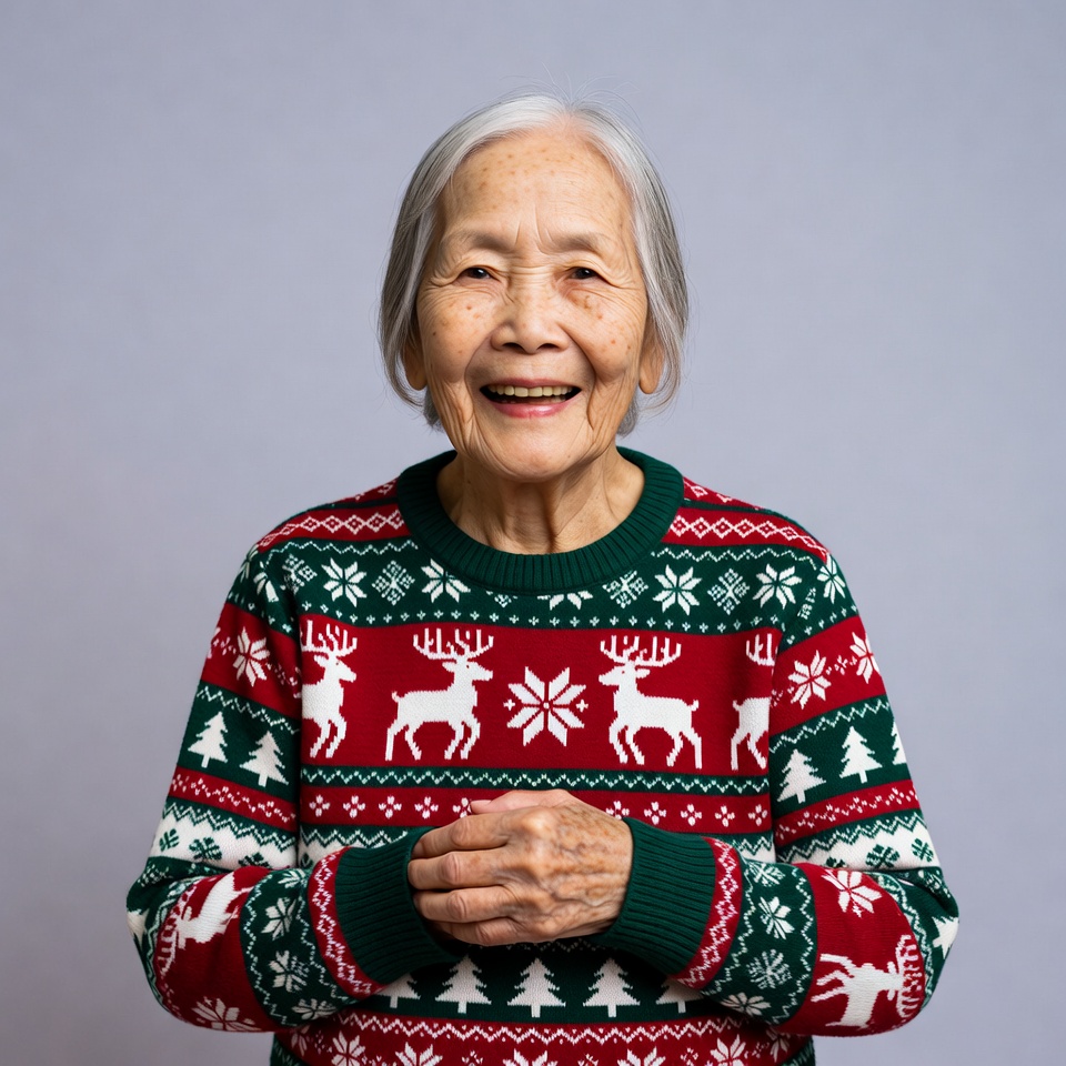 Elderly Asian woman in Christmas sweater