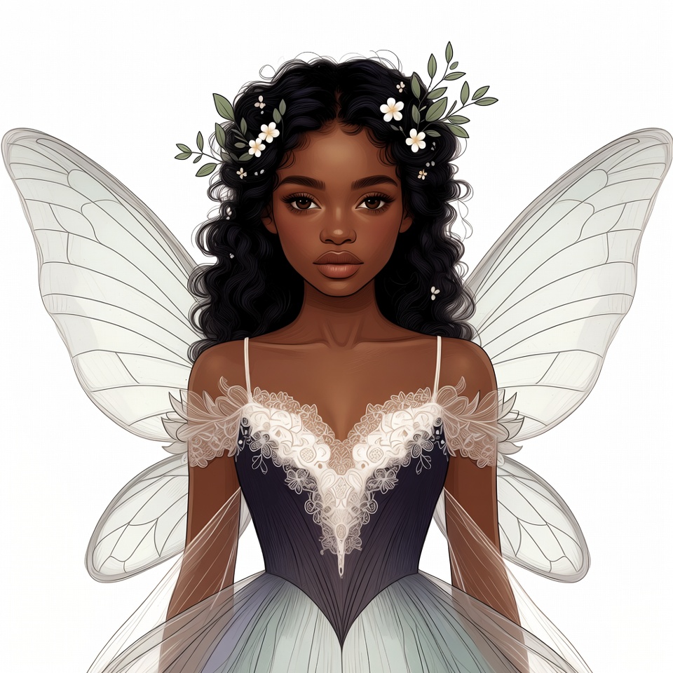 A beautiful Black woman with curly hair wears a floral crown of white flowers and green leaves. She has large translucent wings and a lacy navy blue dress with spaghetti straps. The illustration is on an isolated white background.