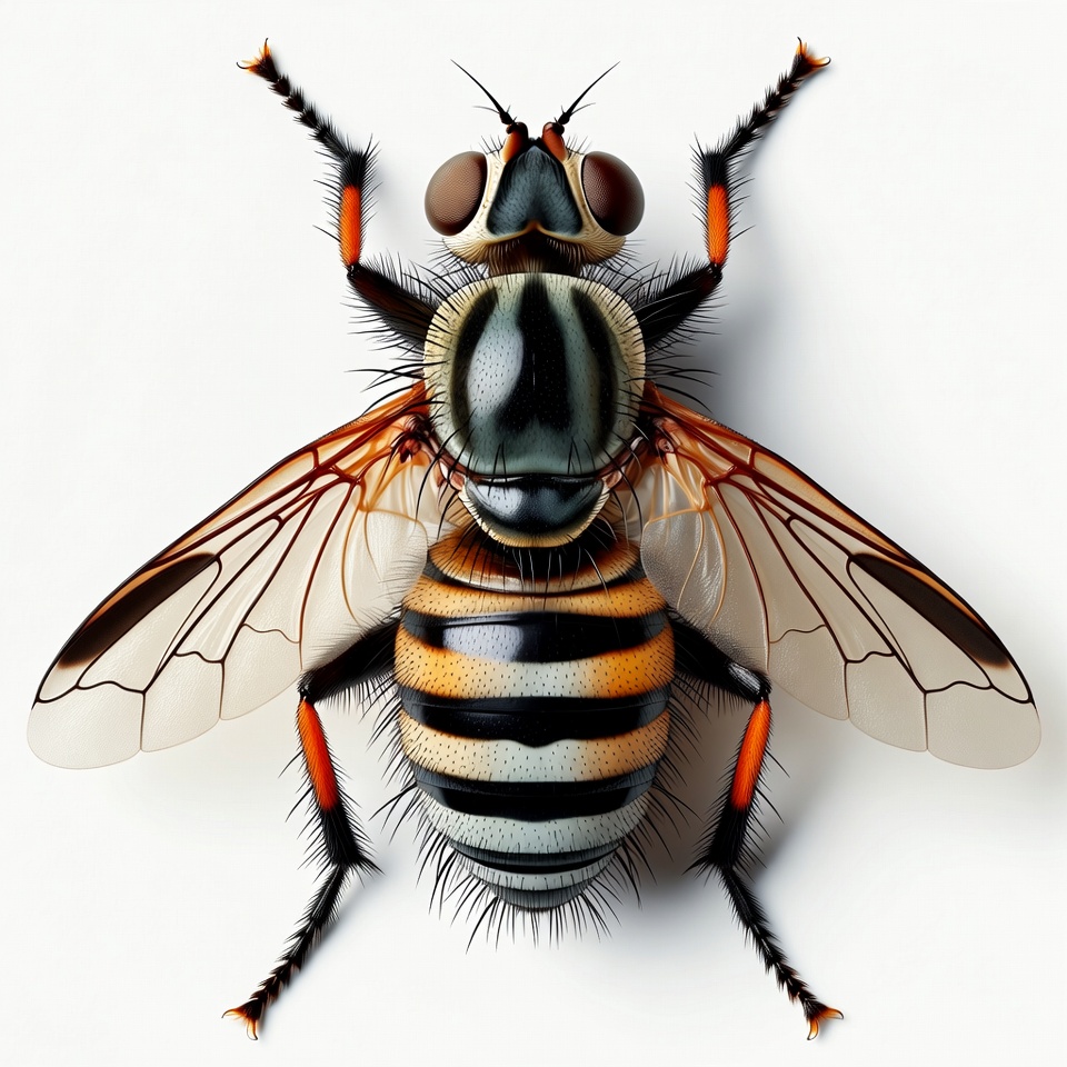 arthropod, bee mimic, bristles, bug, compound eyes, detailed, fly, glossy, illustration, insect, isolated, legs, macro, mimic, nature, orange black, robber fly, striped abdomen, transparent wings, vibrant colors, white background, wings, hoverfly