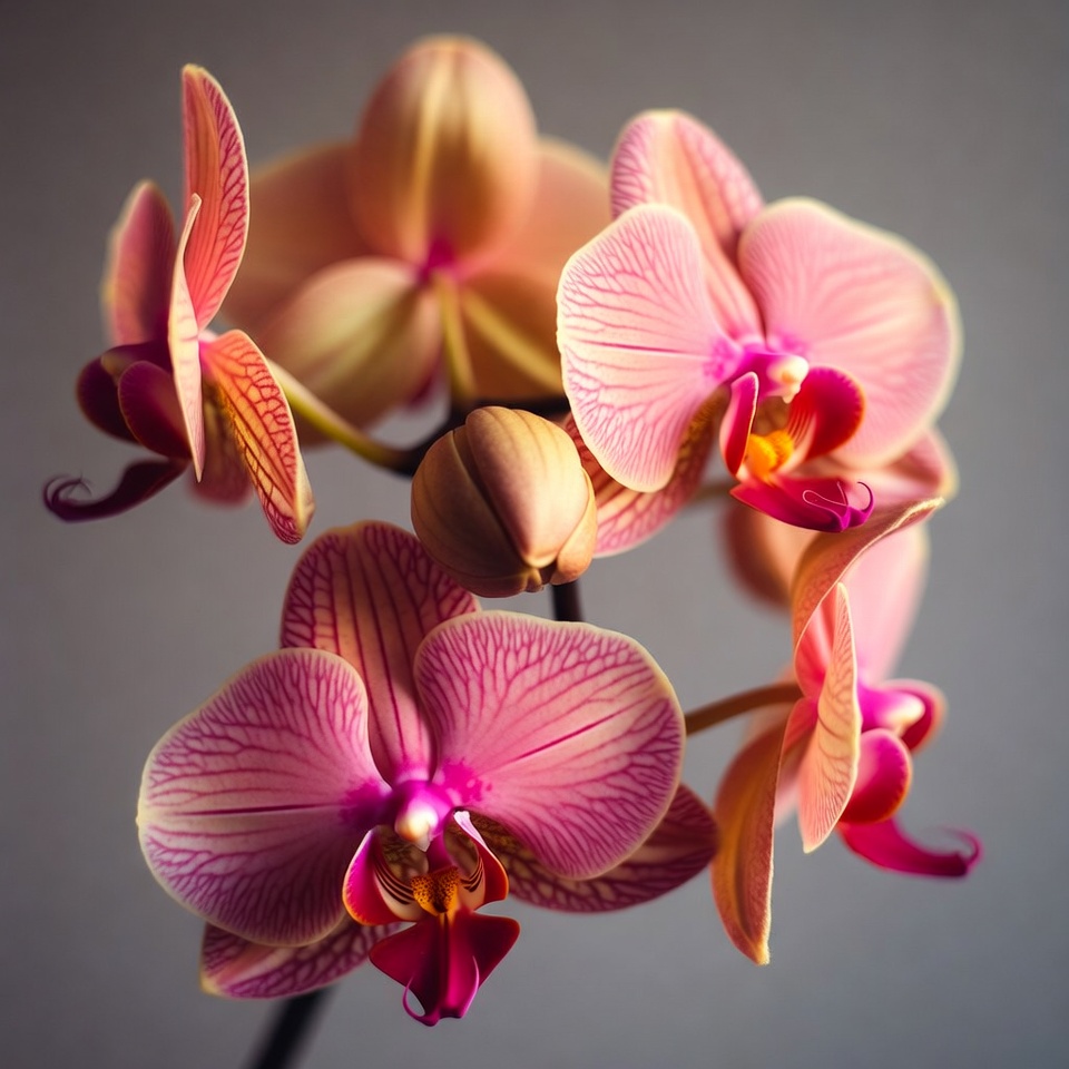 A vibrant cluster of pink Phalaenopsis orchids features delicate veined petals in shades of pink and orange. Several flower buds and stems emerge from the center against a soft gray background. The intricate details of the petals and subtle lighting highlight the flower's natural beauty.