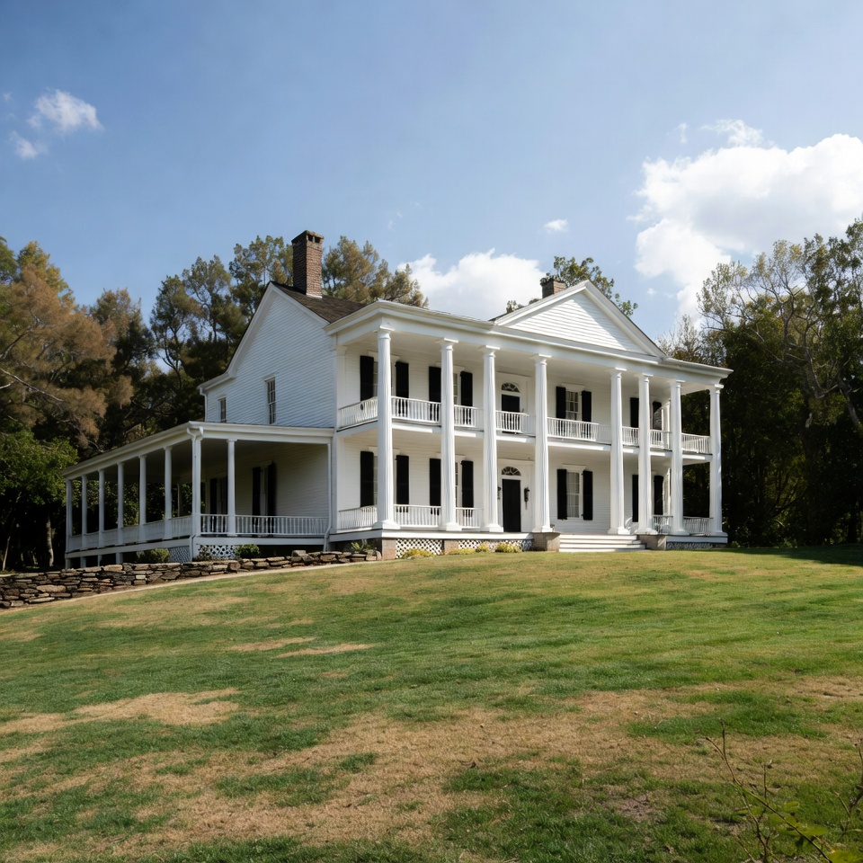 antebellum house, autumn trees, balcony, building, cloudy sky, columns, estate, exterior, foliage, grass, hill, historic architecture, landscape, lawn, neoclassical, pillars, plantation house, porch, residence, shutters, southern mansion, stone wall, trees, white house, mansion
