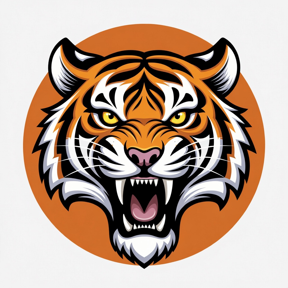 A fierce tiger head illustration features bold orange fur with black stripes and sharp white fangs. The tiger roars with yellow eyes glaring intensely and mouth wide open. It is set against a circular orange background in a vector clipart style.