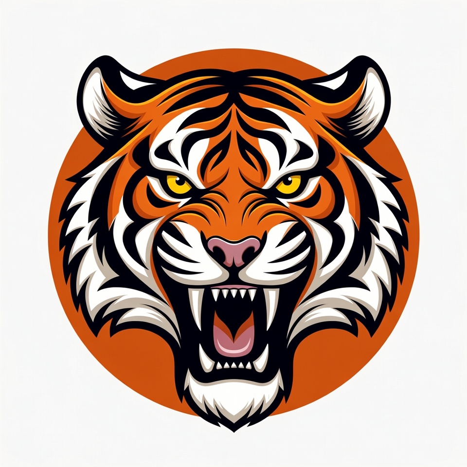 A fierce tiger head illustration features bold orange and black stripes with sharp white fangs bared in a roar. The tiger's intense yellow eyes glare forward, surrounded by a circular orange background. Detailed fur textures and dynamic lines emphasize the aggressive expression.