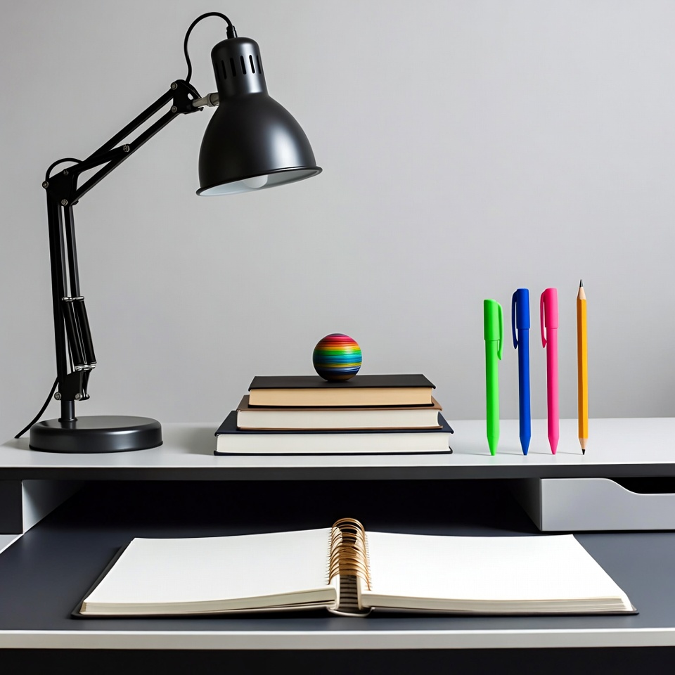 A black adjustable desk lamp sits on a dark desk surface next to a white open binder notebook. In front of the lamp on a white shelf are stacked books, a colorful rainbow ball, and green and orange pens. The setup is on a gray background.