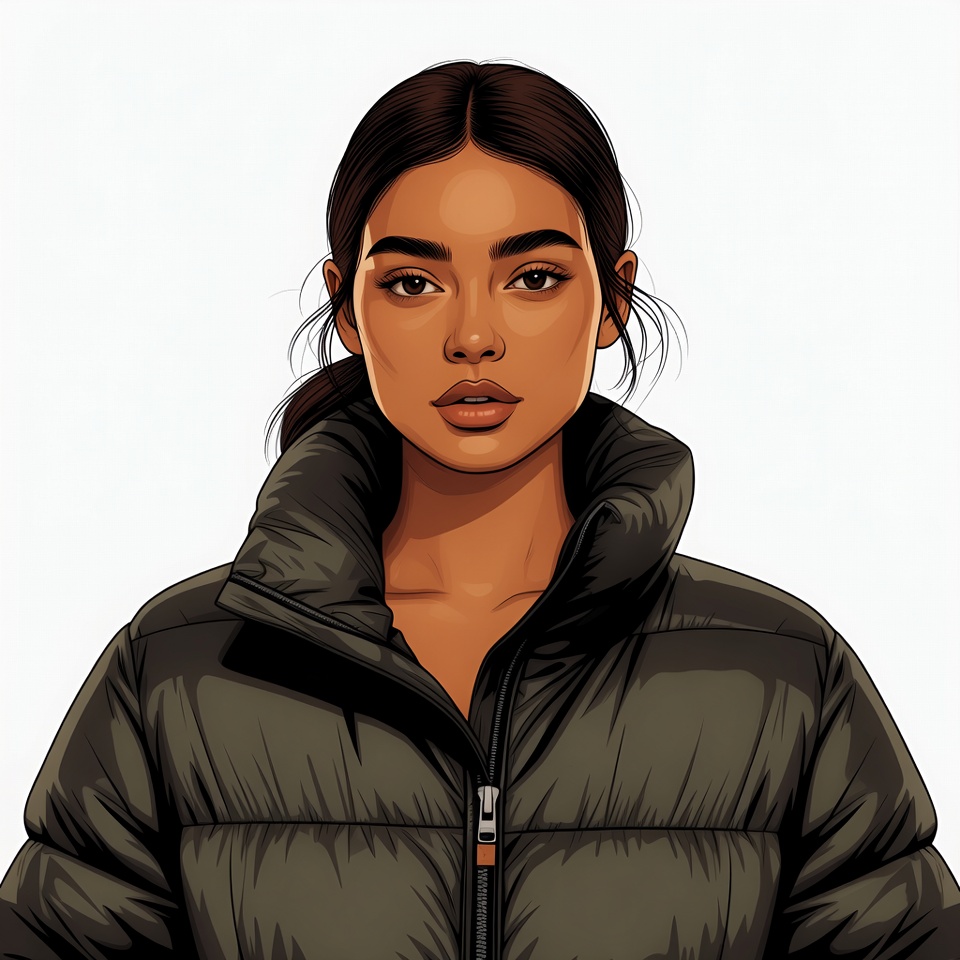 A young Asian woman with long dark hair pulled into a ponytail gazes forward with full lips and striking eyes. She wears a shiny green puffer jacket with a high collar and zipper. The illustration is set against a plain white background.