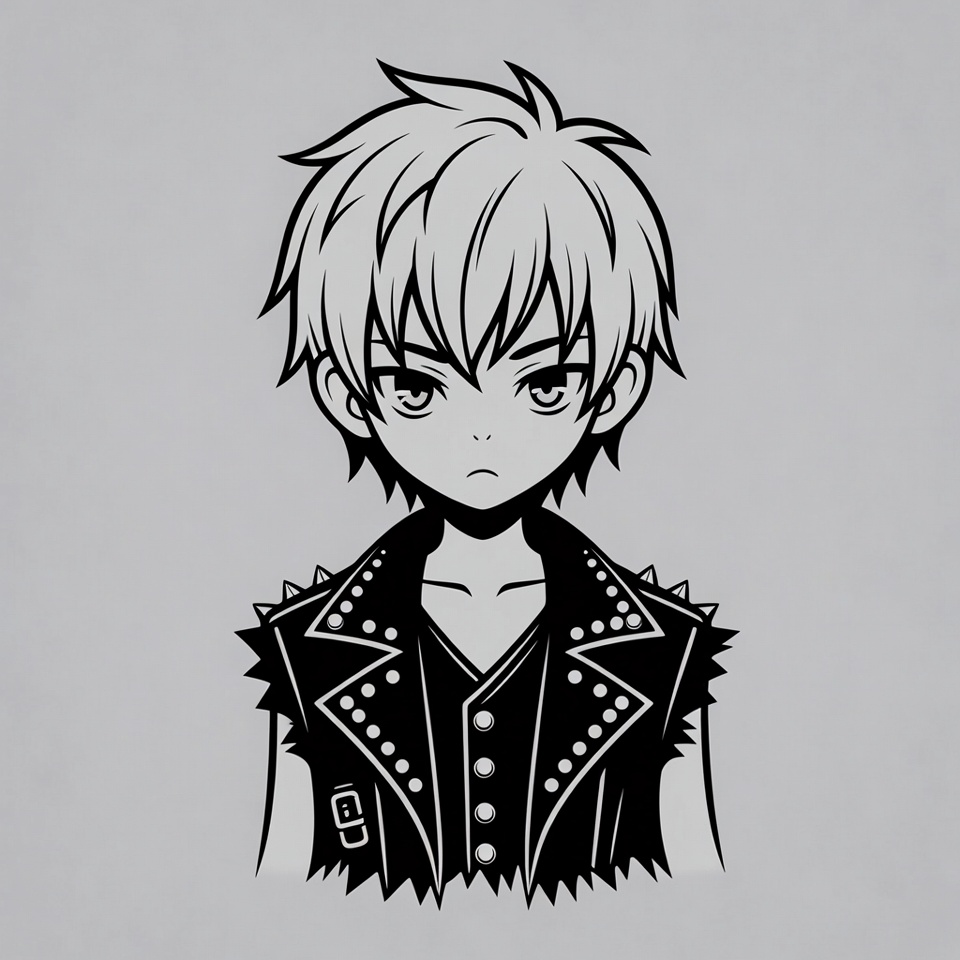 Asian, anime, black and white, blonde hair, boy, cartoon, fringe sleeves, illustration, isolated background, leather jacket, line art, manga, portrait, sharp eyes, spiked jacket, spiky hair, studs, vest, young boy, anime boy