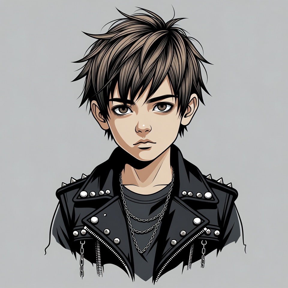 Asian, brown hair, chains, edgy fashion, gray background, illustration, leather jacket, male, manga style, necklace, portrait, spiked jacket, spiky hair, studs, young boy, anime boy