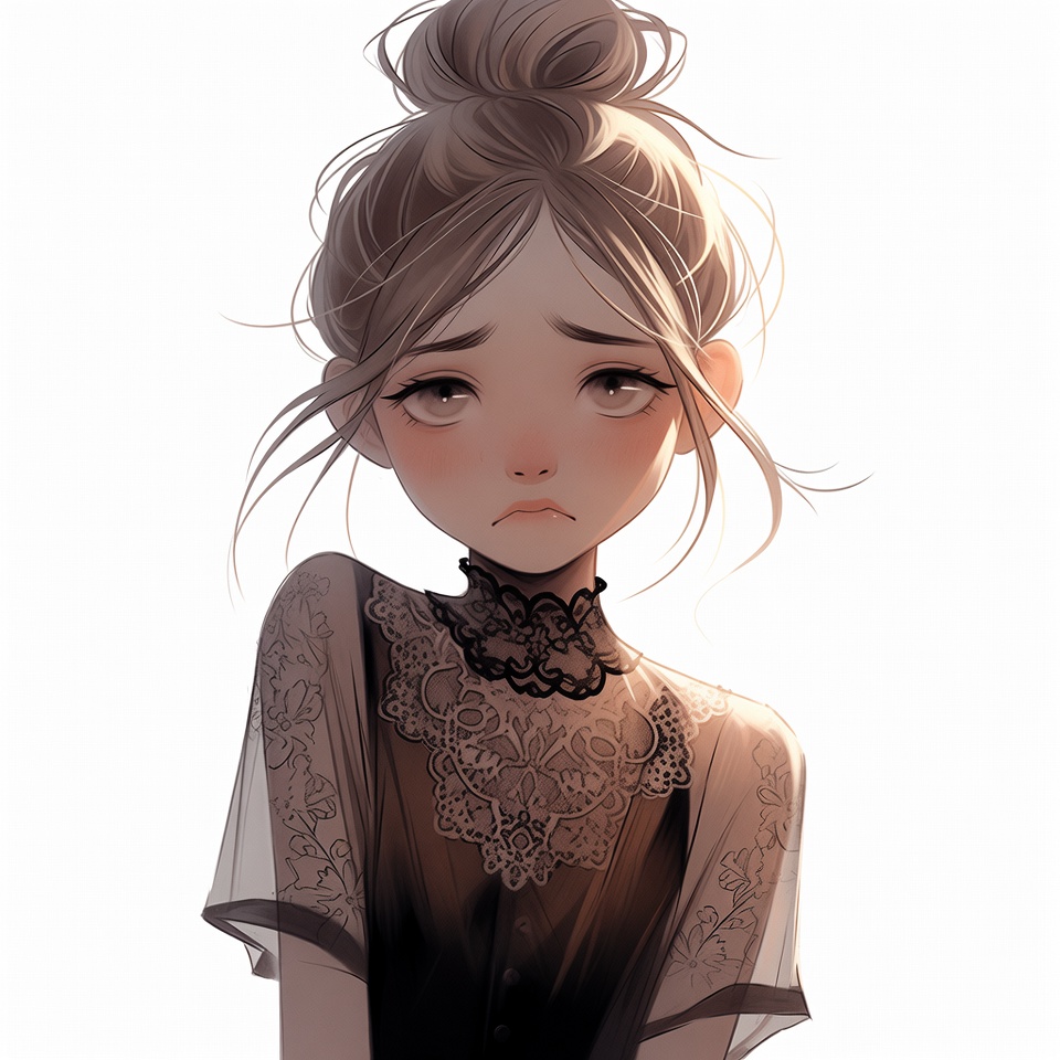 White, anime art, anime illustration, black lace, bun hairstyle, crying girl, emotional face, female, floral lace, illustration, isolated background, lace blouse, messy bun, portrait, pout, sad expression, sad girl, sheer top, soft lighting, teary eyes, young woman, anime girl