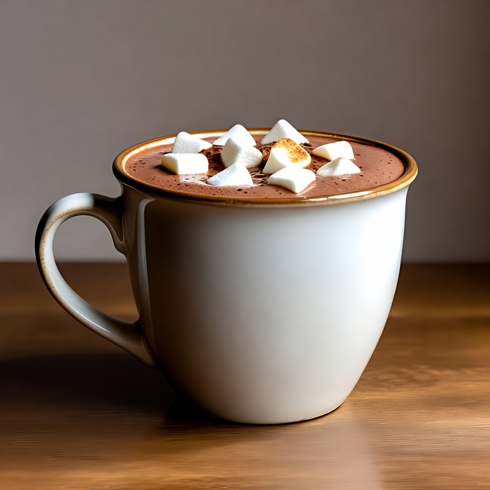 A large white mug filled with rich hot chocolate topped with fluffy white marshmallows sits on a wooden table. The mug has a brown rim and a handle, with soft lighting highlighting the creamy texture. Steam subtly rises from the warm beverage.
