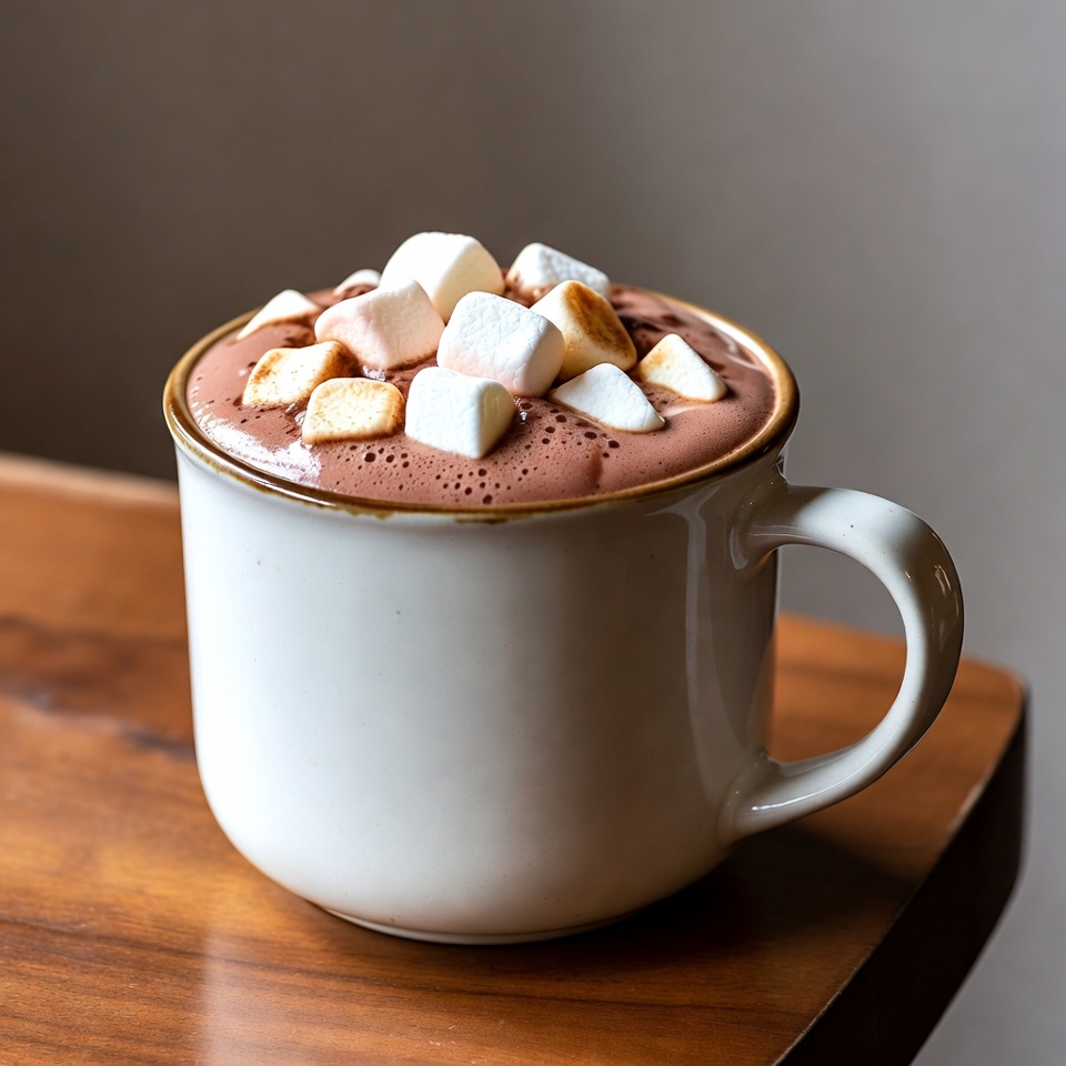 A white ceramic mug filled with rich hot chocolate topped with fluffy white marshmallows sits on a wooden table. The mug has a textured rim and a handle, with creamy foam around the edges. Steam subtly rises from the warm beverage.