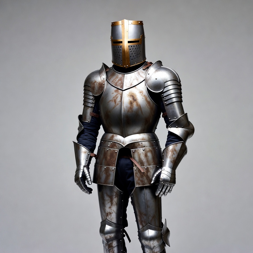 A knight stands in full medieval plate armor with a white cross on the gold helmet. The silver armor shows rust and wear details on the chest plate, arms, and legs. He poses on a plain gray background with blue fabric under the armor and leather straps.