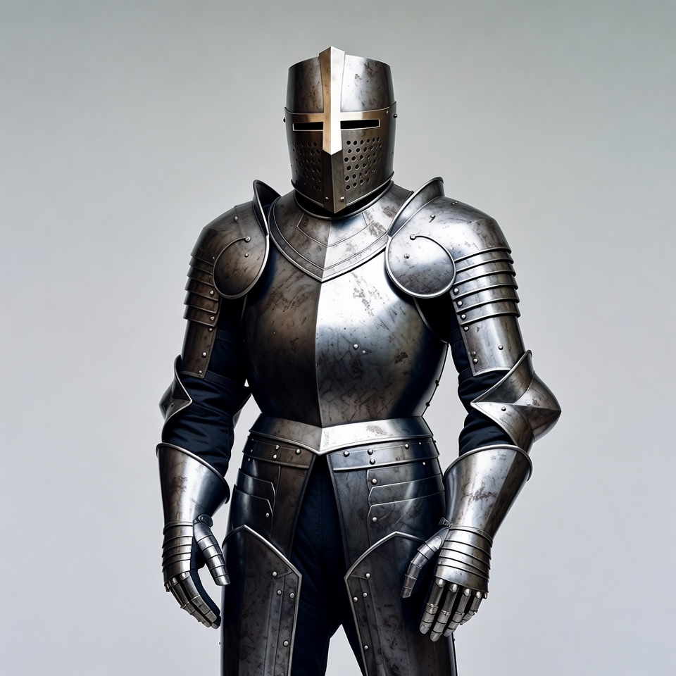 A knight stands in full medieval plate armor on a plain gray background. The armor features a helmet with a cross-shaped slit and detailed metallic pauldrons and gauntlets. He poses confidently with hands at his sides.