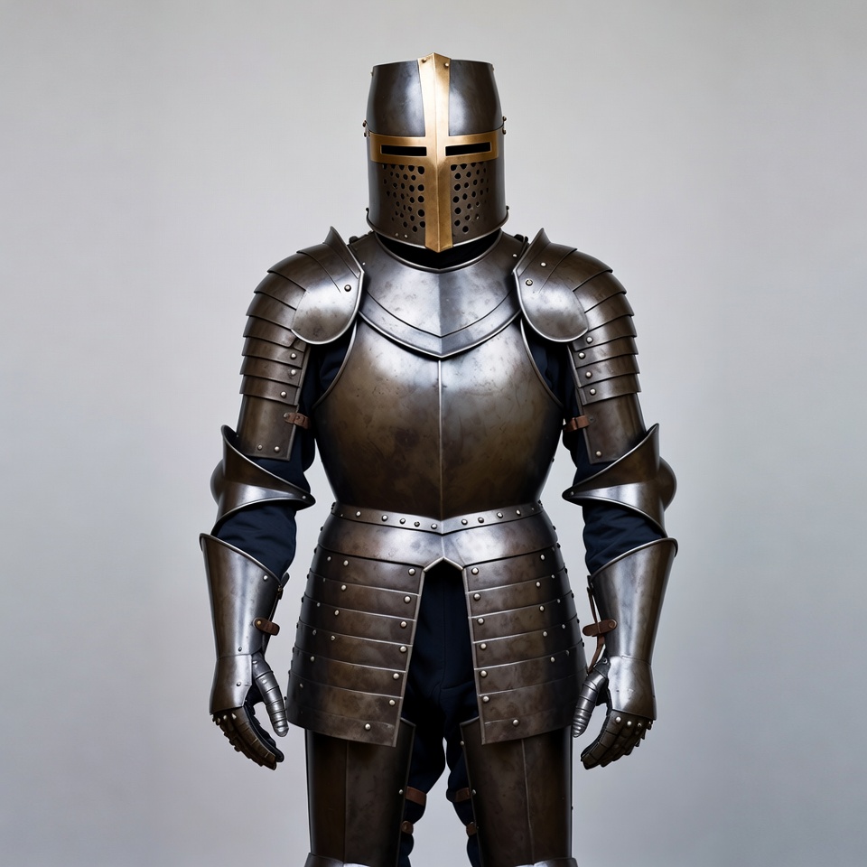 armor, bronze armor, chainmail, crusader cross, dark armor, full armor, gauntlets, gold cross, helmet, historical armor, isolated background, knight helmet, medieval knight, metal armor, plate armor, riveted plates, standing knight, warrior, white background, knight