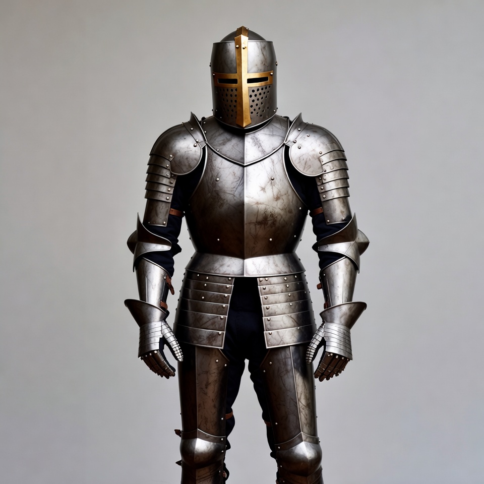 A knight stands in full medieval plate armor with a gold cross on the helmet. The silver armor features riveted plates on the chest, arms, and legs. He poses frontally against a plain white background.