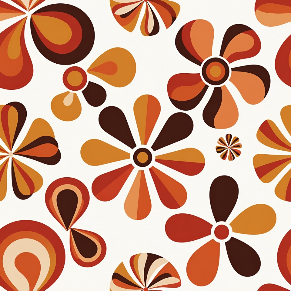 70s design, abstract flowers, brown flowers, clipart, colorful flowers, daisy flowers, floral illustration, flower pattern, groovy pattern, illustration, midcentury modern, orange flowers, orange pattern, organic shapes, psychedelic flowers, seamless pattern, tan flowers, vector flowers, white background, retro flowers