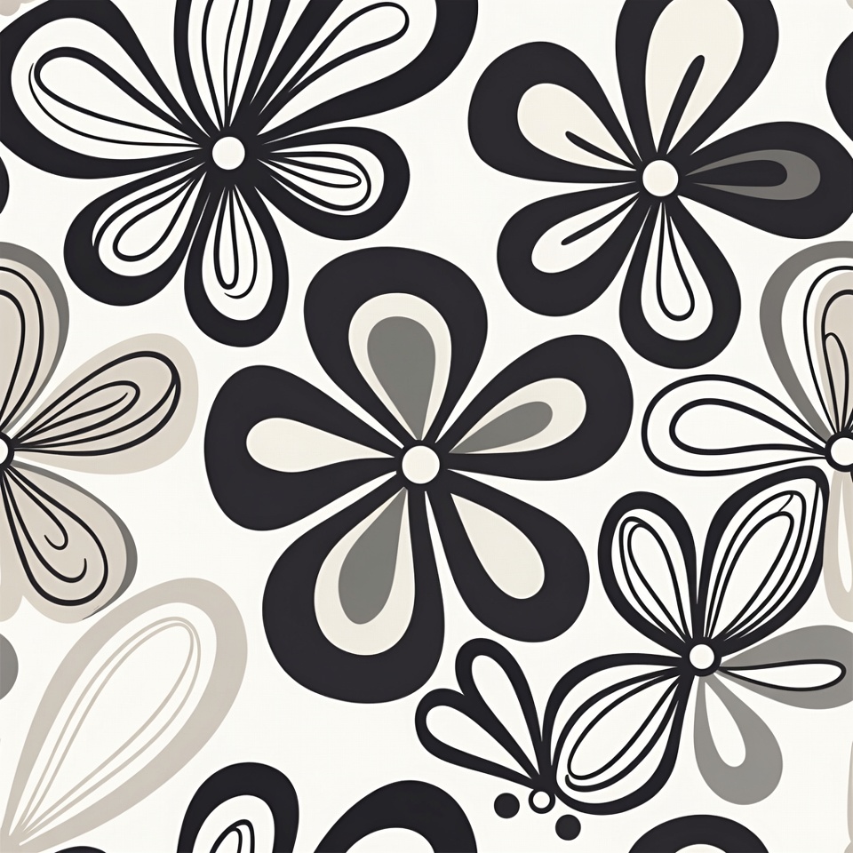 A seamless pattern features large abstract flowers in black, white, and gray tones on a white background. The flowers have bold outlines and curved petals in various shades. A butterfly is included among the floral elements.