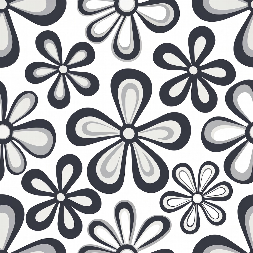 abstract flowers, black white flowers, bold outlines, clipart flowers, daisy pattern, floral seamless, flower illustration, graphic flowers, gray shading, illustration pattern, modern floral, monochrome pattern, petal design, repeating pattern, retro flowers, seamless floral, stylized flowers, vector flowers, white background, flower pattern