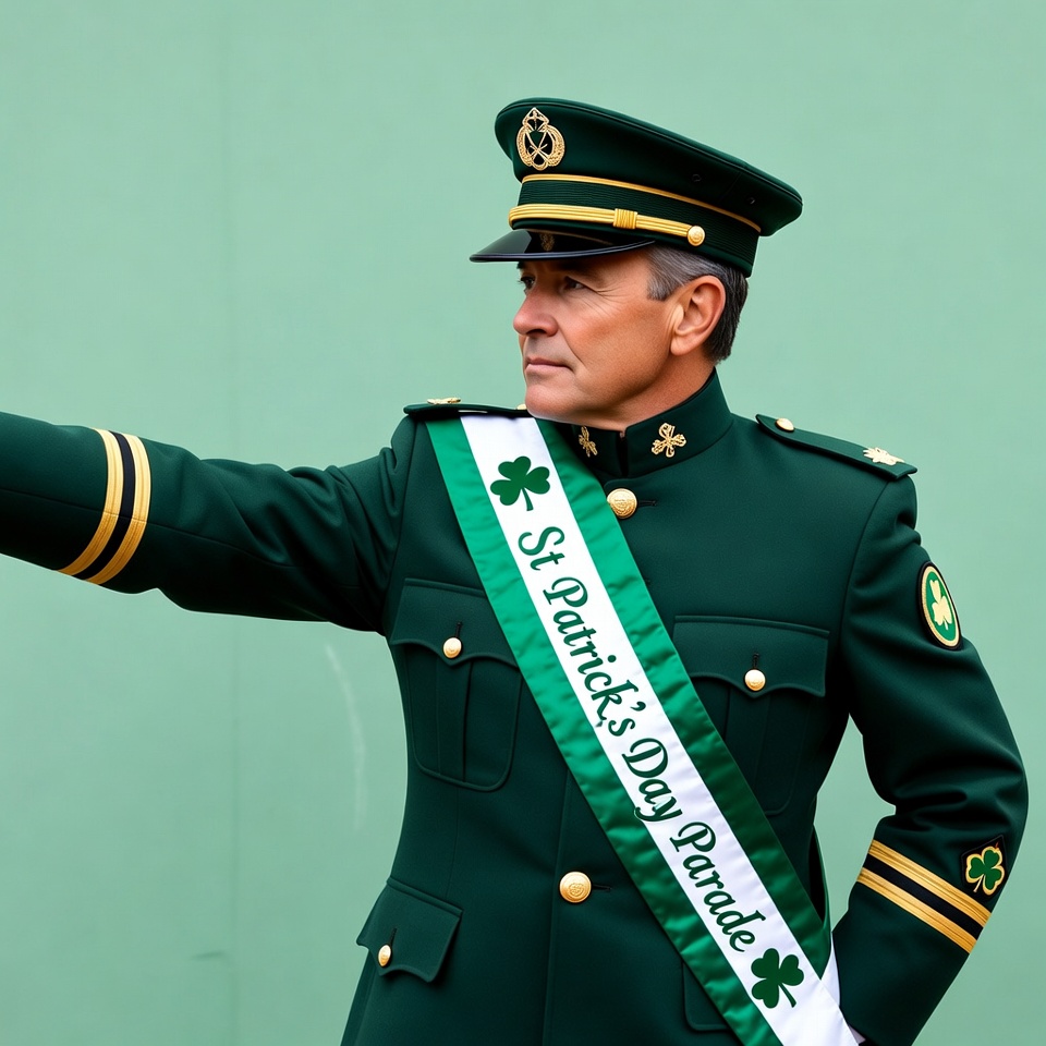 Irish parade, March 17, Saint Patrick, St. Patrick's Day, White, arm extended, dress uniform, emerald green, epaulets, formal attire, gold buttons, green background, green uniform, holiday uniform, male, military uniform, parade, peaked cap, pointing, sash, shamrocks, soldier uniform, man