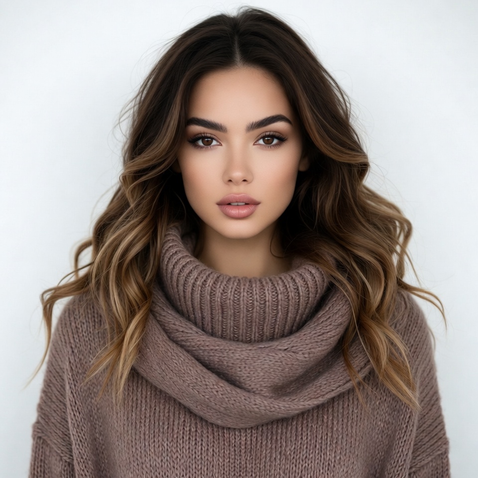 A young woman with long wavy brown hair and striking makeup poses confidently against a white background. She wears a cozy brown turtleneck sweater that highlights her elegant features. Her expression is poised with subtle lips pursed.