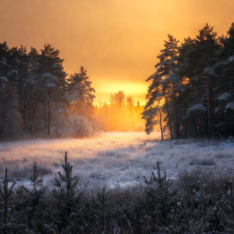 cold weather, dramatic sky, evergreen trees, forest, frosty, frozen grass, golden light, landscape, nature, orange sky, pine trees, silhouettes, snow, snowy field, sunrise, trees, winter, woods, sunset